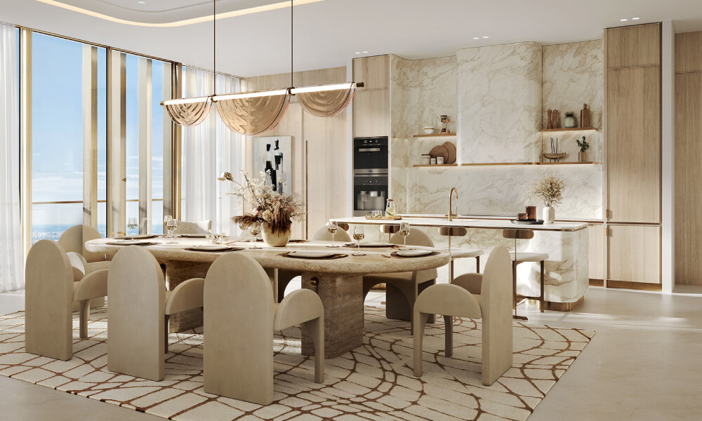 Every residence is crafted as a private sanctuary, featuring high ceilings, retractable glass walls, seamless indoor-outdoor flow, and exceptionally curated interiors. Crafted with refined minimalism, spaces include marble flooring, custom-designed wood veneer cabinetry, spa-inspired bathrooms with soaking tubs, and floor-to-ceiling windows. Kitchens are fitted with quartz countertops and high-end built-in appliances.