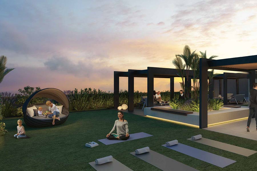 Beautifully landscaped gardens with barbecue areas, a designer swimming pool and inspiring outdoor lounge areas with wide open spaces add a dose of tranquillity to the air. With a sophisticated colour palette that includes whites, warm grey quartz countertops and beige porcelain-tiled floor, the interiors create a soft and serene atmosphere.