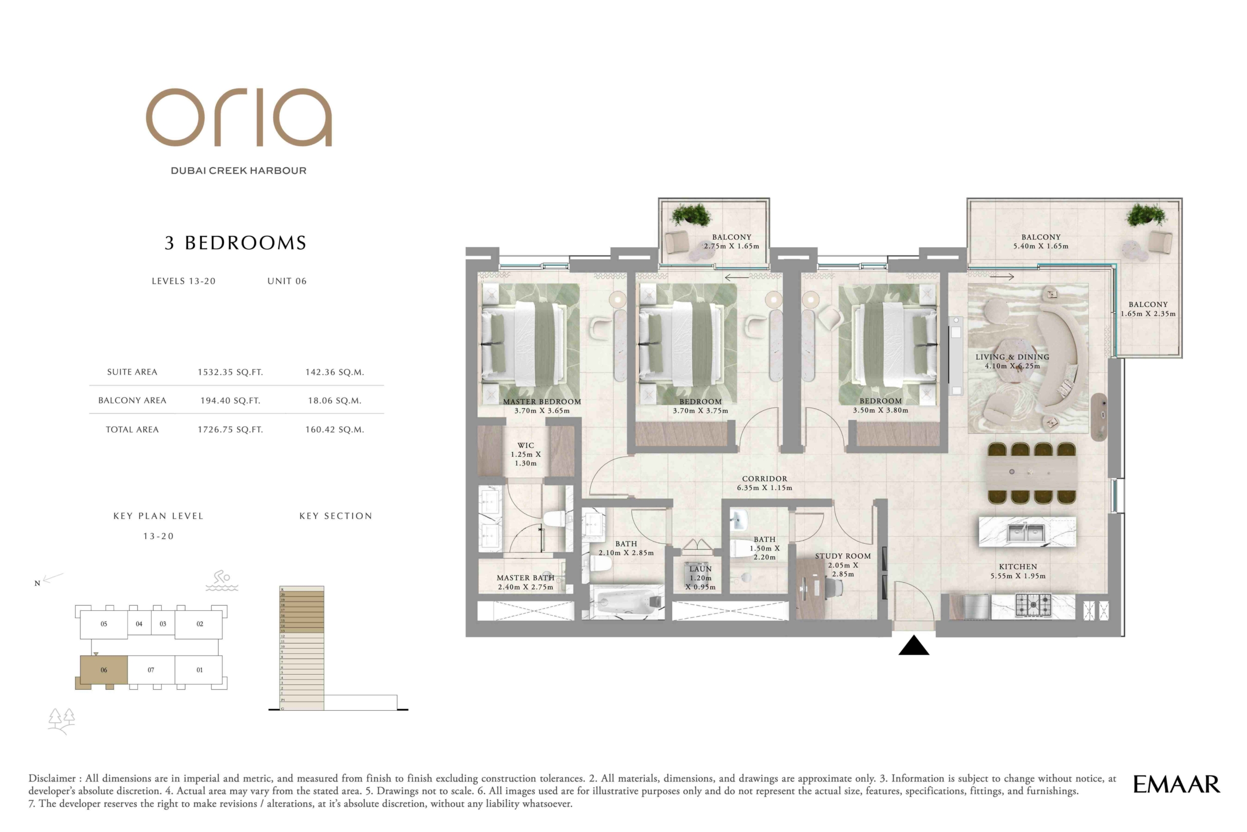 The residences at Oria offer sizes ranging from 749 sq. ft to 1,727 sq. ft. Each unit is designed with 1-3 balconies, while the 3-bedroom apartments boast additional amenities such as a study and a laundry room.