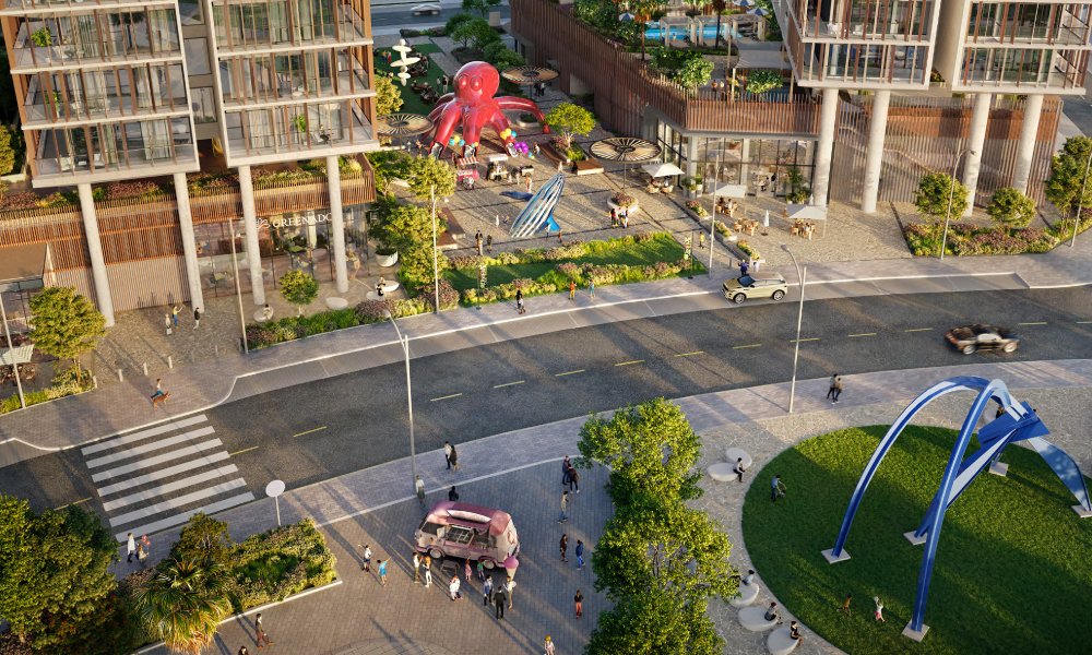 Biophilic Design – Naturally inspired living with integrated greenery, water features, and shaded pedestrian pathways.